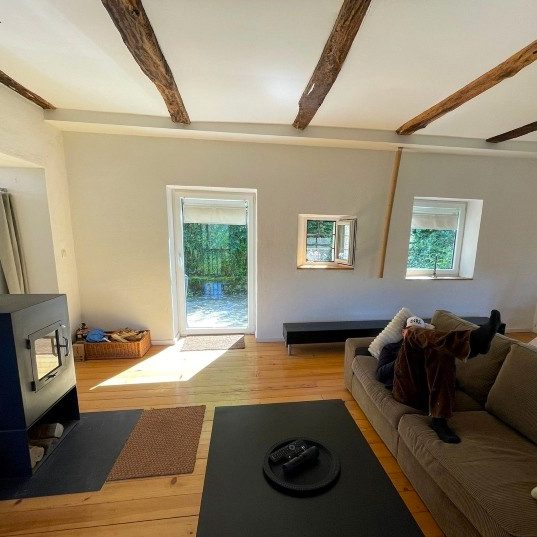 Gemütliches Wohnzimmer mit Holzofen.