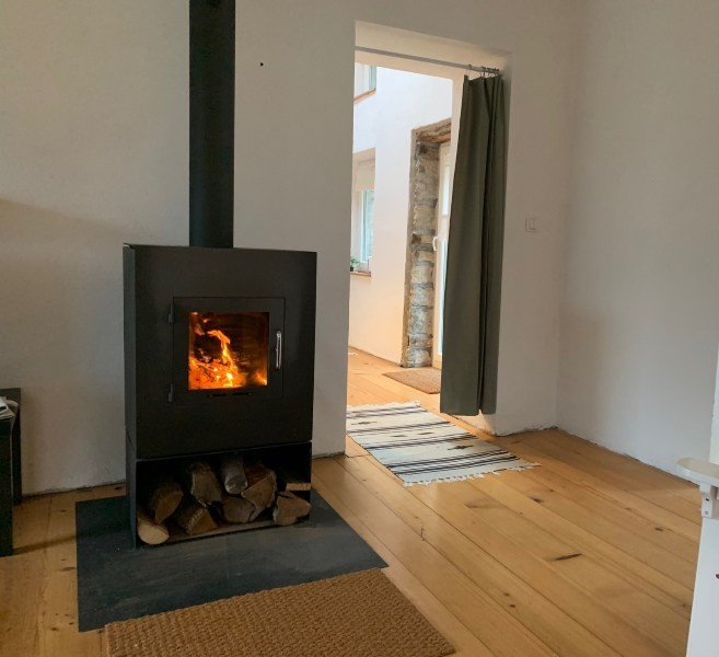 Gemütliches Wohnzimmer mit Holzofen.